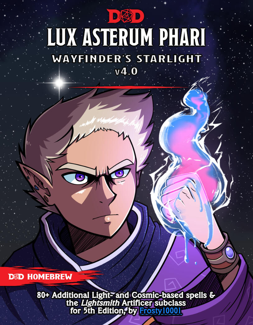 "Wayfinder's Starlight," a new school of magic pioneered by Opus Loregit that draws upon the energy of the cosmos, stars, space, and prisms to manifest into various effects. Stored in vibrant, colorful crystals, this malleable, liquid light can be sculpted and flash-forged to suit the whims of the caster, taking the form of prismatic orbs, chromatic mirages, protective halos, twisted light, and much more. Also includes new subclasses like the Lightsmith Artificer!Each spell was made to produce a myriad of different and unique effects! Learn more about the homebrew including extensive design commentary.