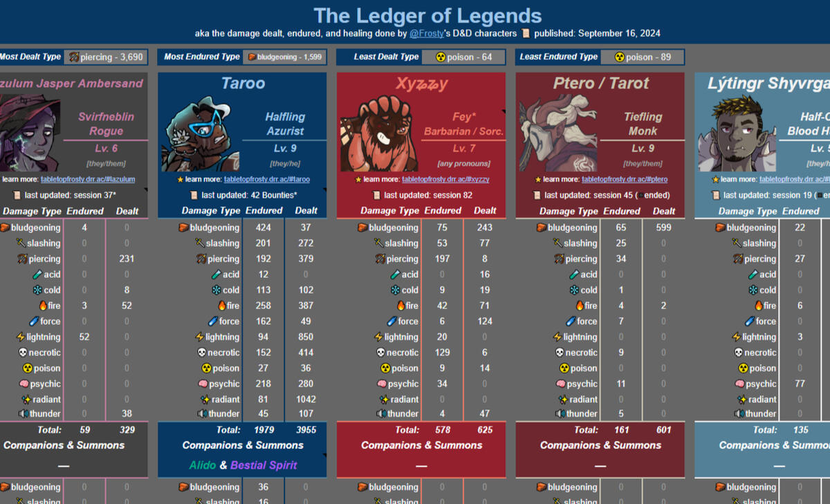 As a habitual notetaker my brain compels me to write over several novels' worth of words in notes for all the TTRPG games I play. Including thorough combat logs. Turn-by-turn. And as a stats nerd, I made Ledger of Legends to compile all the numbers!Check out the damage endured, dealt, and healing done by all of my D&D characters as of the publication date on the Google Sheet.